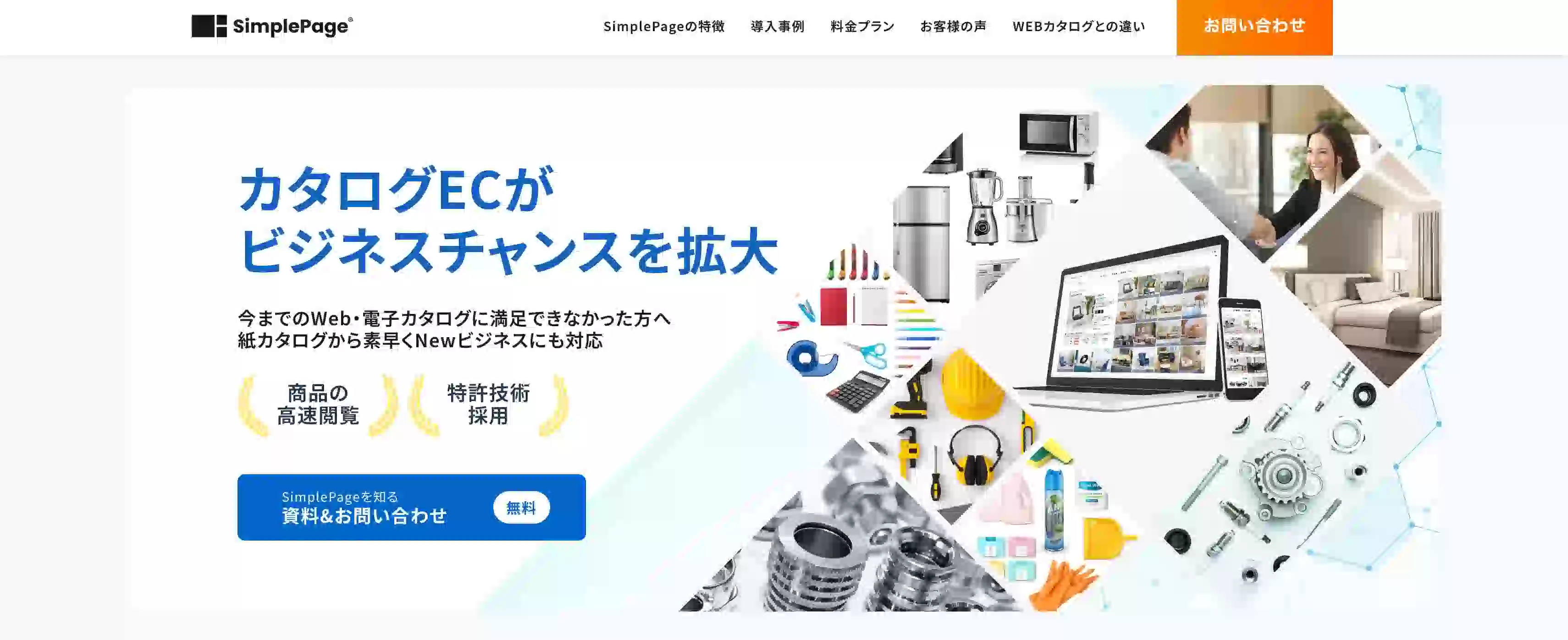 | SimplePage | カタログのようなデザイン性とWebサイトのような情報量・更新性を融合した新しい販売プラットフォーム。AIを活用した機能も充実。 | クラウド(サーバ占有):39,000円/月 | 使いやすさとコストの柔軟性、販促媒体の改善を重視する企業。 |