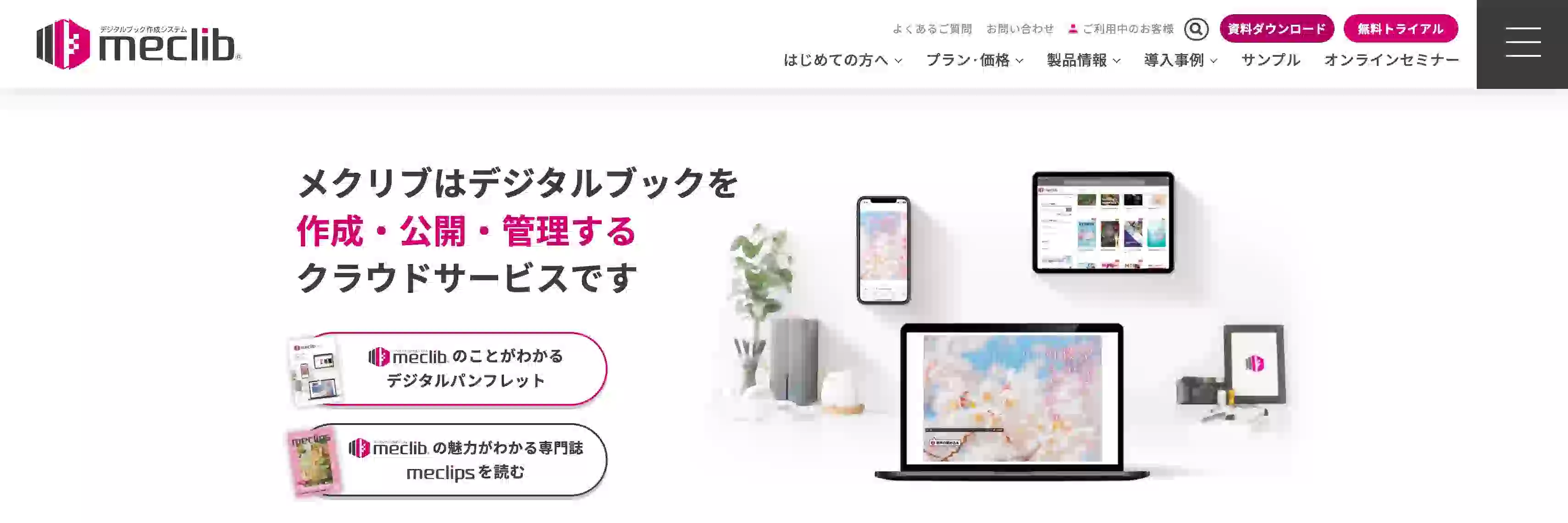 | meclib | ECサイト連携、動画・音声などコンテンツ埋め込みが可能なツール。型番検索などのカスタムデータベース機能も搭載。 | クラウドプランプレミアムコース:55,000円/月 | デジタルブックを販売促進機能やECサイトと強力に連携させたい企業。 |